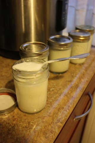 Once the thermometer reached 115 I mixed in the starter yogurt the instructions called for (three tablespoons of plain yogurt with live cultures in it) and filled up my mason jars. NOTE: the results were uneven, some jars were pure yogurt and others were more like drinkable yogurt. In my next batch I added more starter yogurt (half a pint's worth) and whipped it around the pot with my immersion blender for even distribution. This worked much better.
